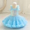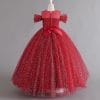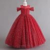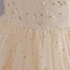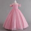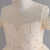 The off the shoulder design with puffy sleeves showcases sweetness. The tulle skirt is covered with golden sequins, and the upper body is embellished with pearls, exuding nobility and refinement.